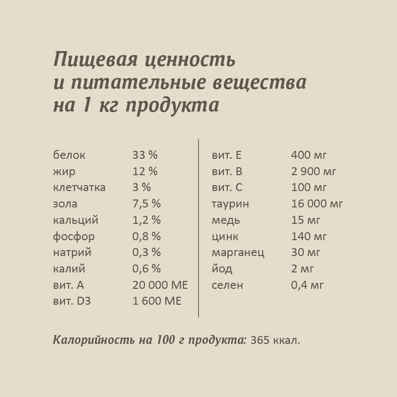 | Пищевая ценность | сырой белок 34%, сырой жир 12%, сырая клетчатка 3%, сырая зола 7%, кальций 1,3%, фосфор 0,8%, натрий 0,3%, калий 0,6% |