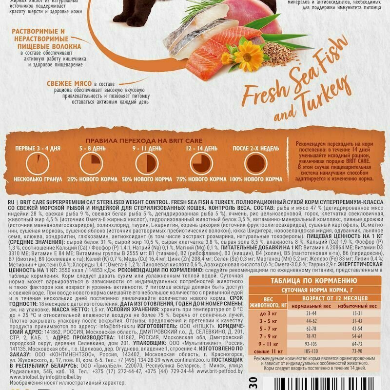 BRIT CARE,Сухой корм с морской рыбой и индейкой для стерилизованных кошек "Cat Sterilised Weight Control", 0.4кг
