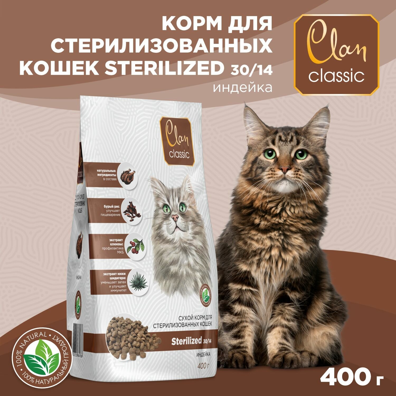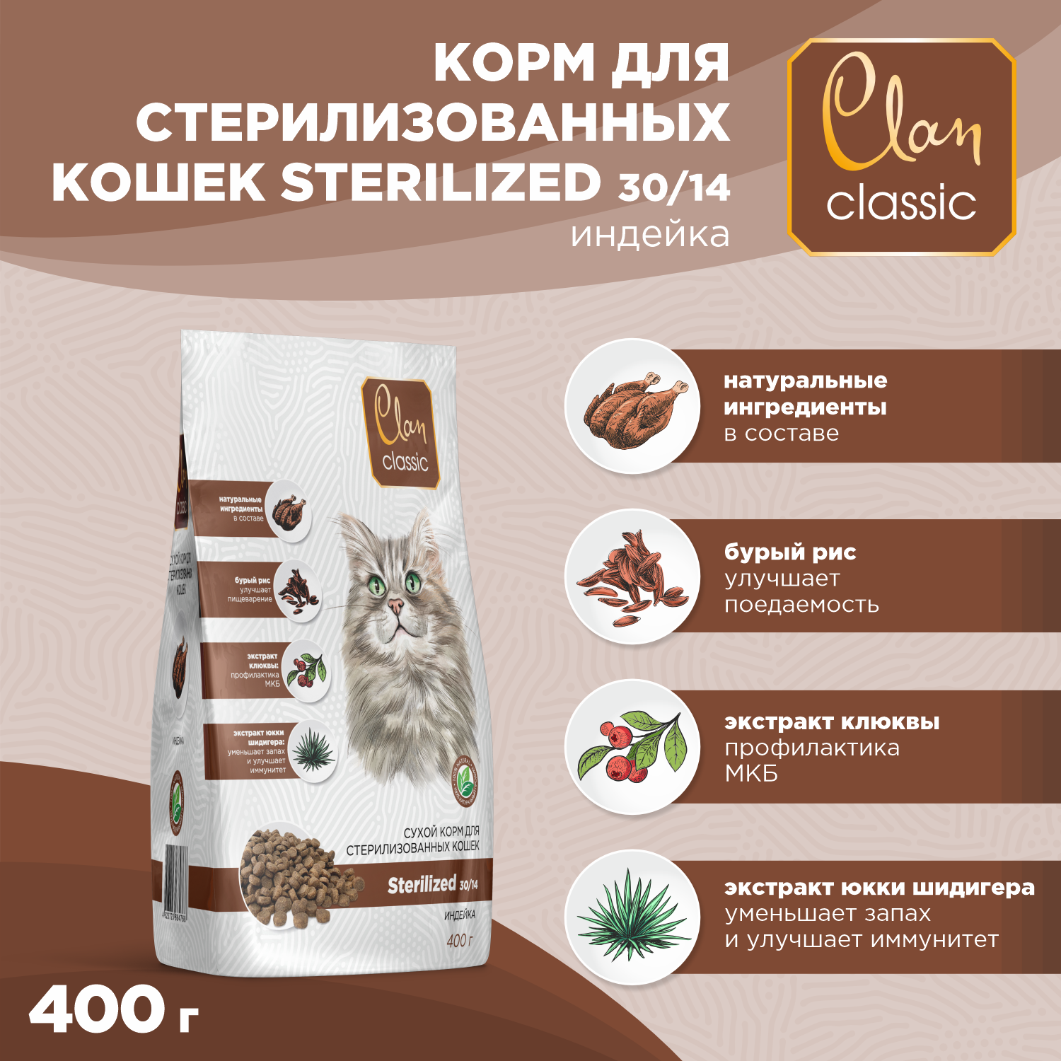 CLAN CLASSIC STERILIZED 30/14 для взрослых кастрированных котов и стерилизованных кошек с индейкой (0,4 кг)