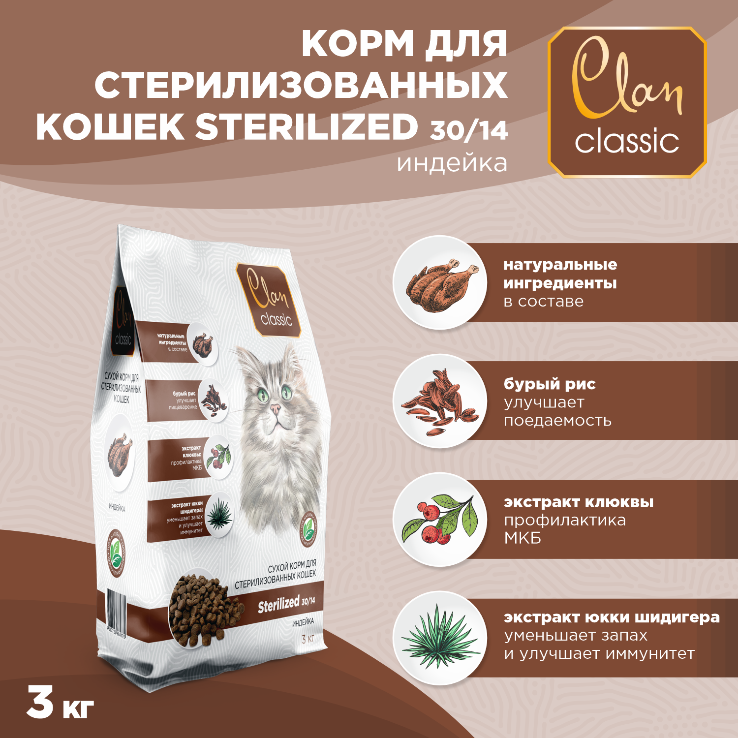 CLAN CLASSIC Sterilized-30/14 Корм для стерилизованных кошек, 3 кг