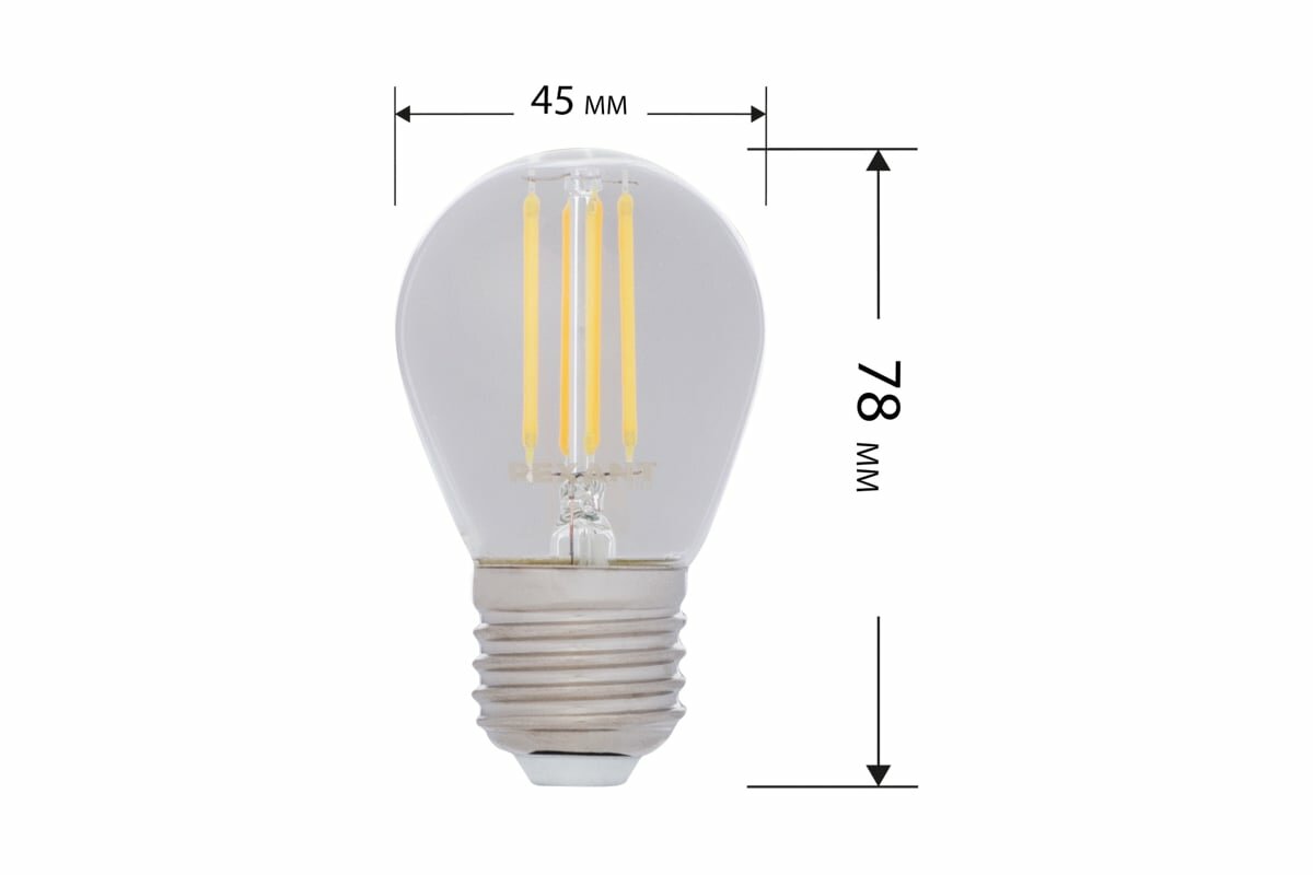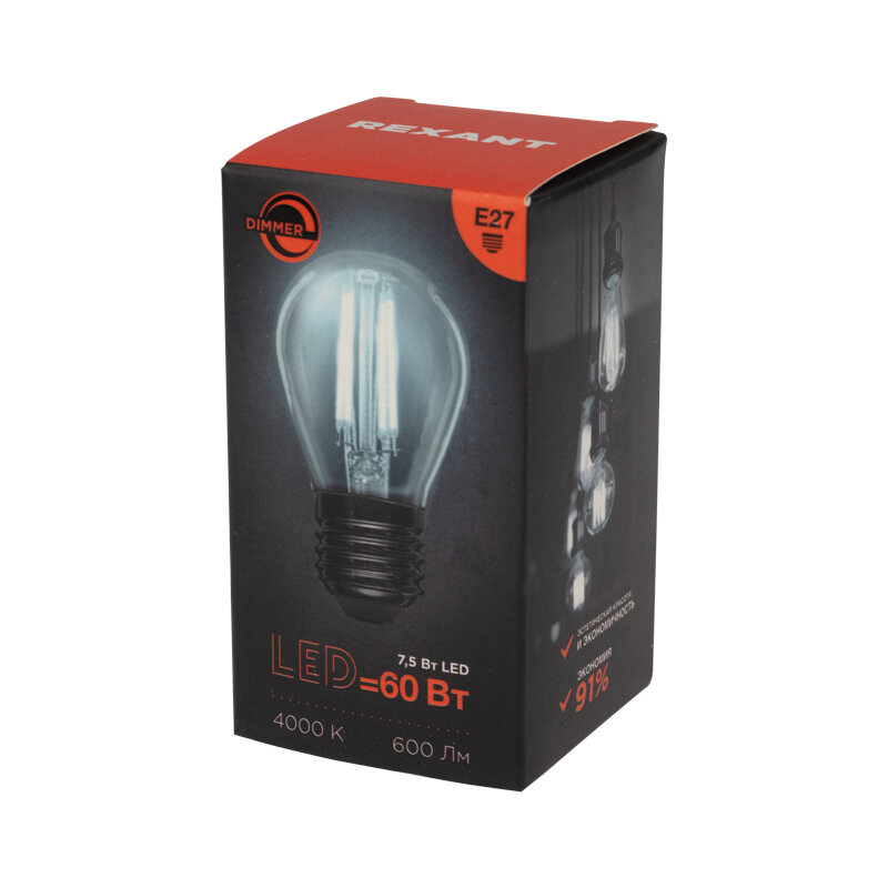 Лампа Rexant 604-128 филаментная шарик GL45 7.5 Вт 600 Лм 4000K E27 диммируемая, прозрачная колба