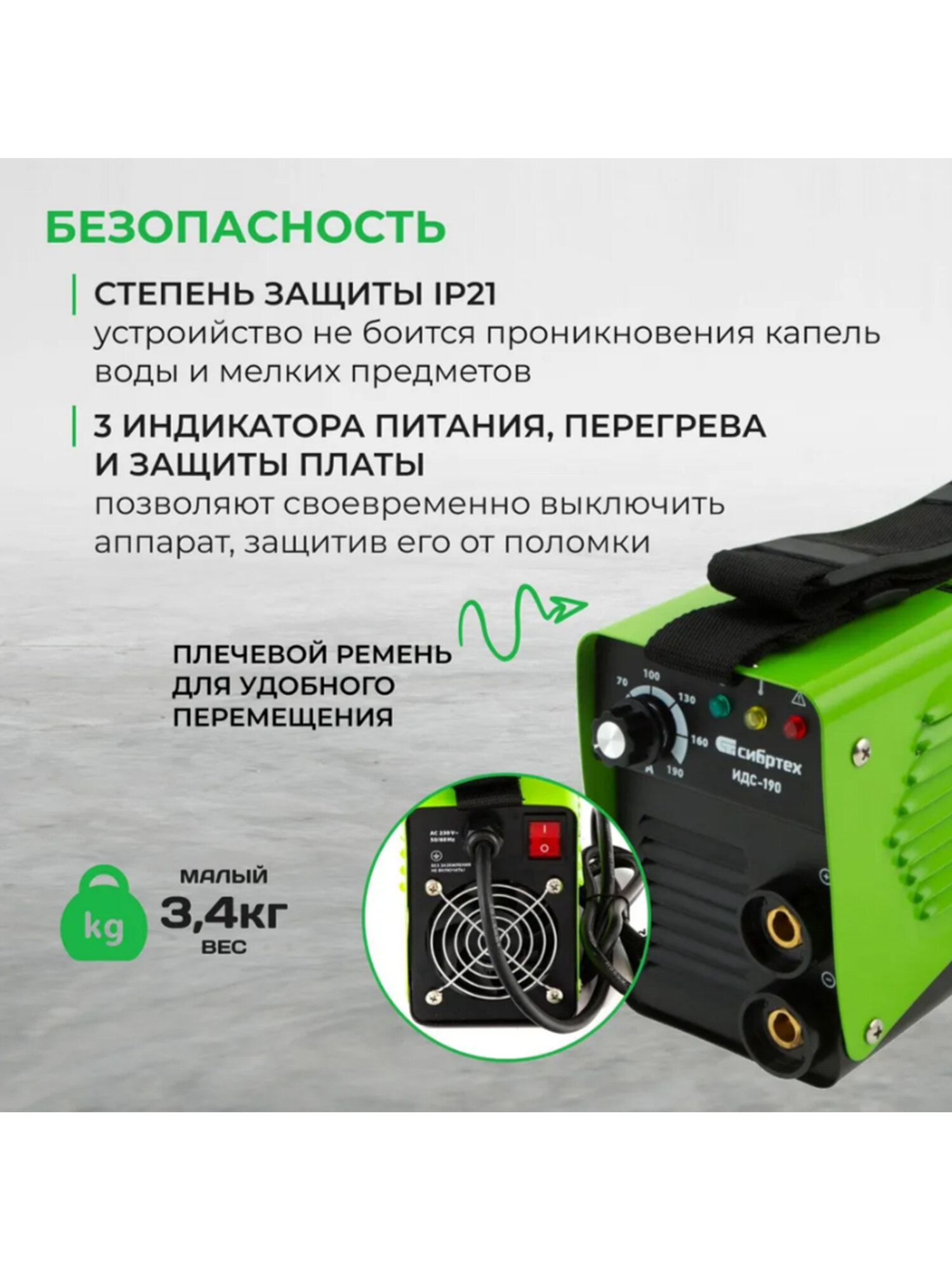 Ниже Вы можете прочитать отзывы на СИБРТЕХ Инверторный аппарат дуговой сварки ИДС-190K, 190 А, ПВ 80, диам.эл. 1,6-4 мм 94394, ознакомится с подробными характеристиками, посмотреть интересные обзоры и фотографии на СИБРТЕХ Инверторный аппарат дуговой сварки ИДС-190K, 190 А, ПВ 80, диам.эл. 1,6-4 мм 94394.