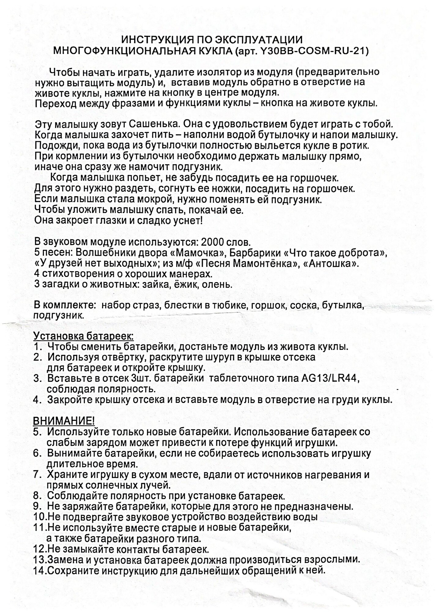 Пупс озвученный Барбарики Сашенька 30см, пьет, пис, наб страз, блестки, 4 акс Карапуз Y30bb-cosm-ru- . интересное: