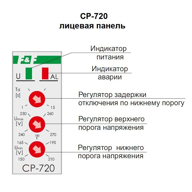 Реле напряжения CP-720 (однофазный; контроль верхнего и нижнего значений напряжения; 150-450В AC 16А 1NO/NC IP20) F&F EA04.009.002