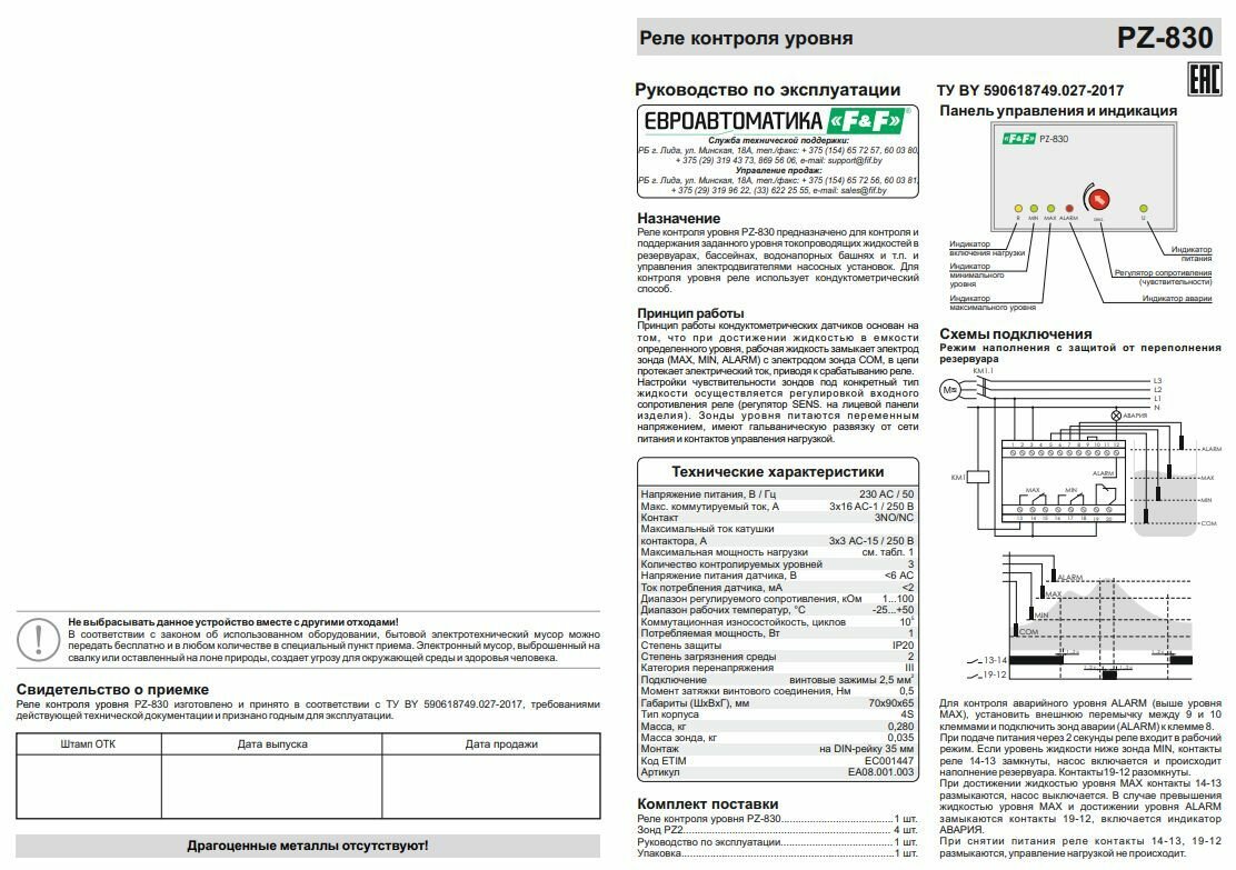 Трехуровневое реле контроля уровня жидкости F&F PZ-830 EA08.001.003