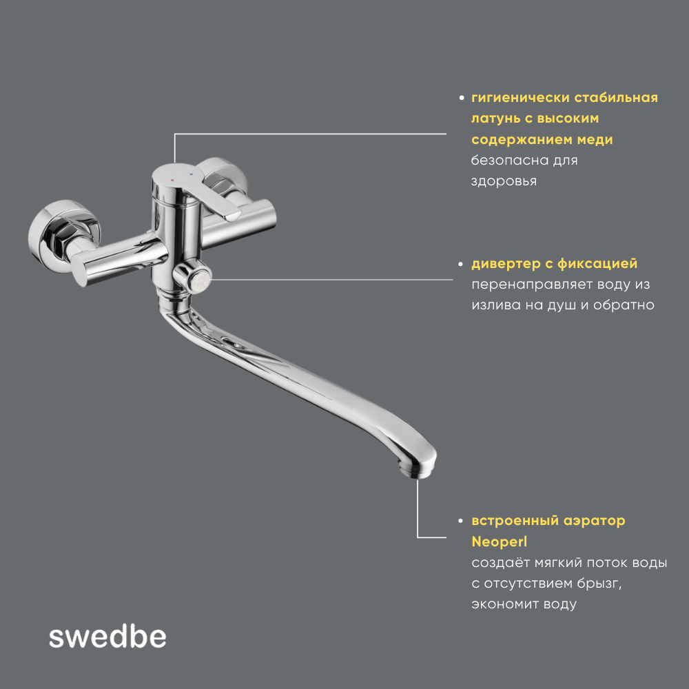 Купить Смеситель для ванны/душа Swedbe Diana М234951 настенный, однозахватный, длинный S-излив 350 мм, хром
