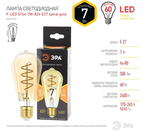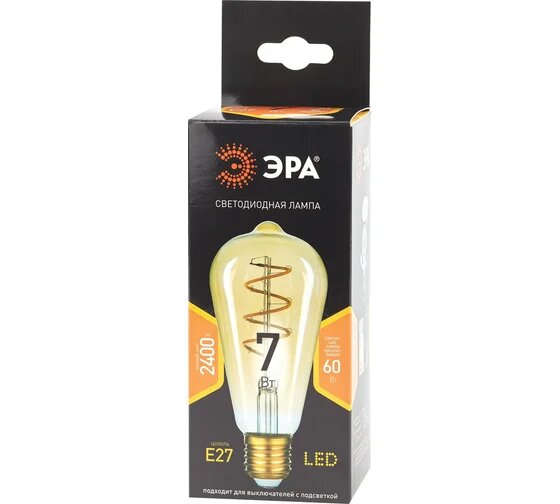СохранитьФиламентная лампа ЭРА Fled ST64-7W-824-E27 spiral gold, спираль, золото, 7Вт, теплая, E27, 20/960 Б0 . интересное: