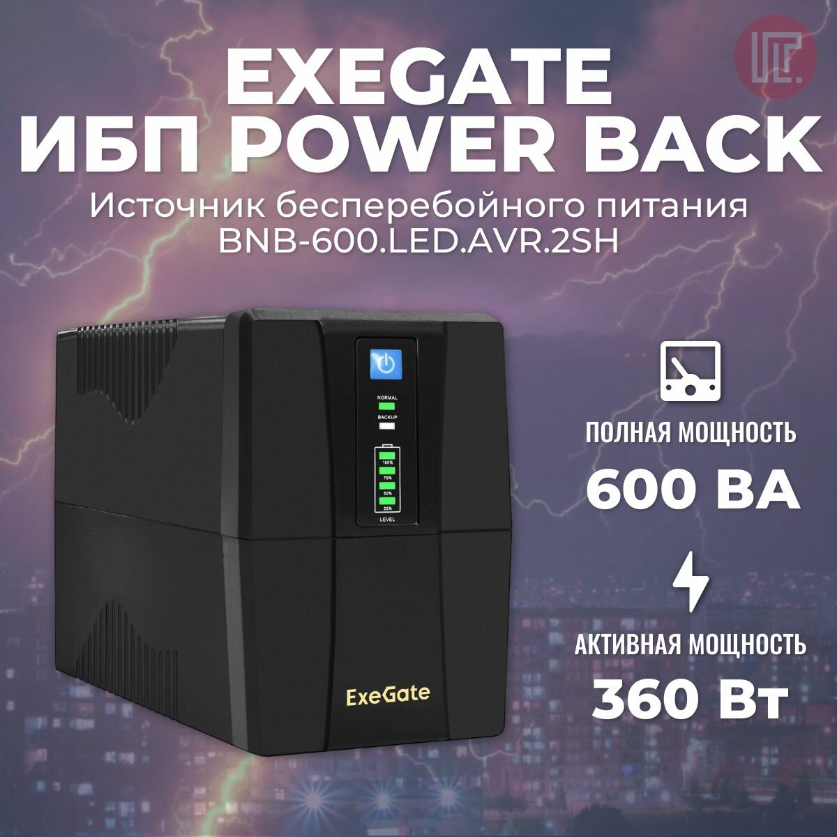 ИБП ExeGate Power Back BNB-600.LED.AVR.2SH <600VA/360W, LED, AVR,2*Schuko, металлический корпус, Black>
