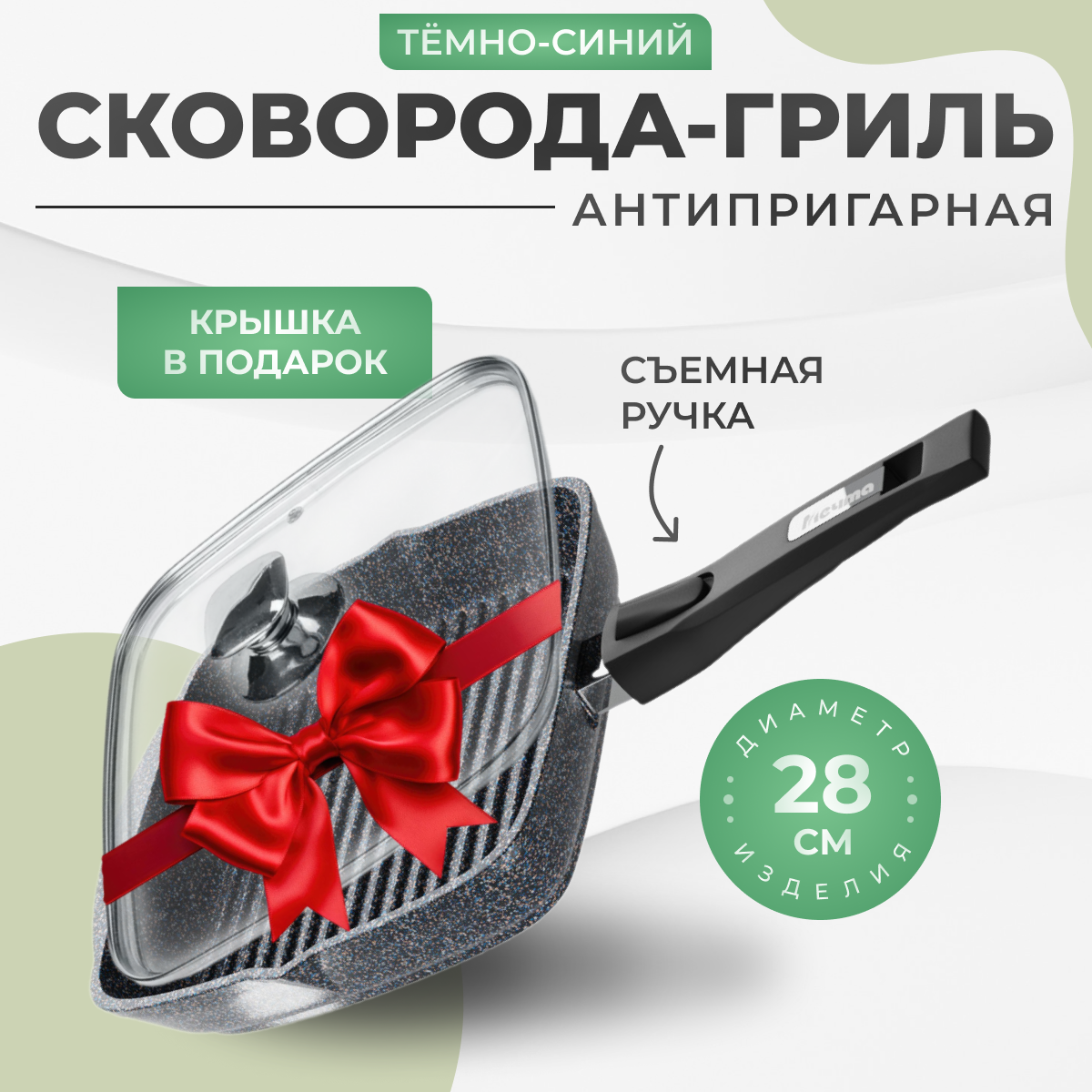Сковорода гриль Мечта квадратная 28х28 см Гранит с антипригарным покрытием с несъемной ручкой и крышкой, НЕ индукционная