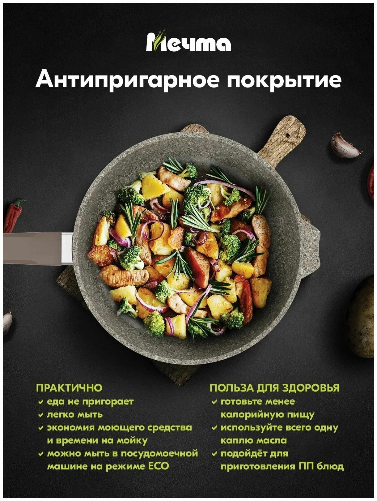 Сковорода Мечта 28 см Премиум с антипригарным покрытием с несъемной ручкой, НЕ индукционная