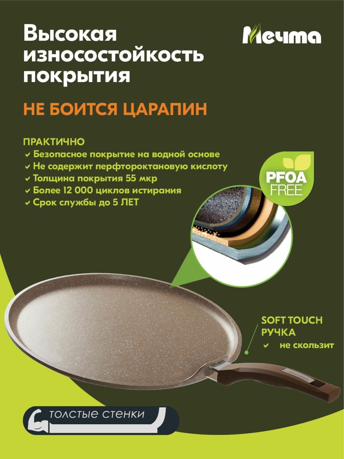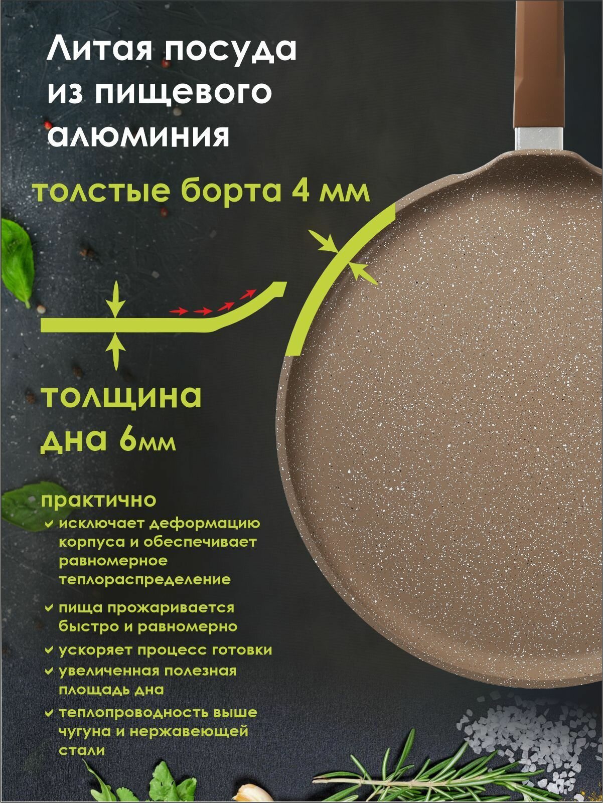 Сковорода мечта 26см с ручкой, антипригарное покрытие, Гранит, brown