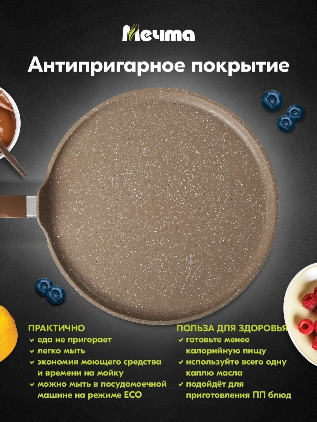 Сковорода мечта 24см с ручкой, антипригарное покрытие, Гранит, brown