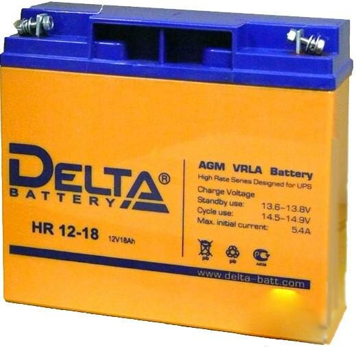 Батарея DELTA серия HR, HR 12-18, напряжение 12В, емкость 18Ач (разряд 20 часов), макс. ток разряда (5 сек.) 230А, макс. ток заряда 5.4А, свинцово-кислотная типа AGM, клеммы под гайку и болт M6, ДxШxВ 181х77х167мм., вес 6.1кг., срок службы 8 лет. Delta U