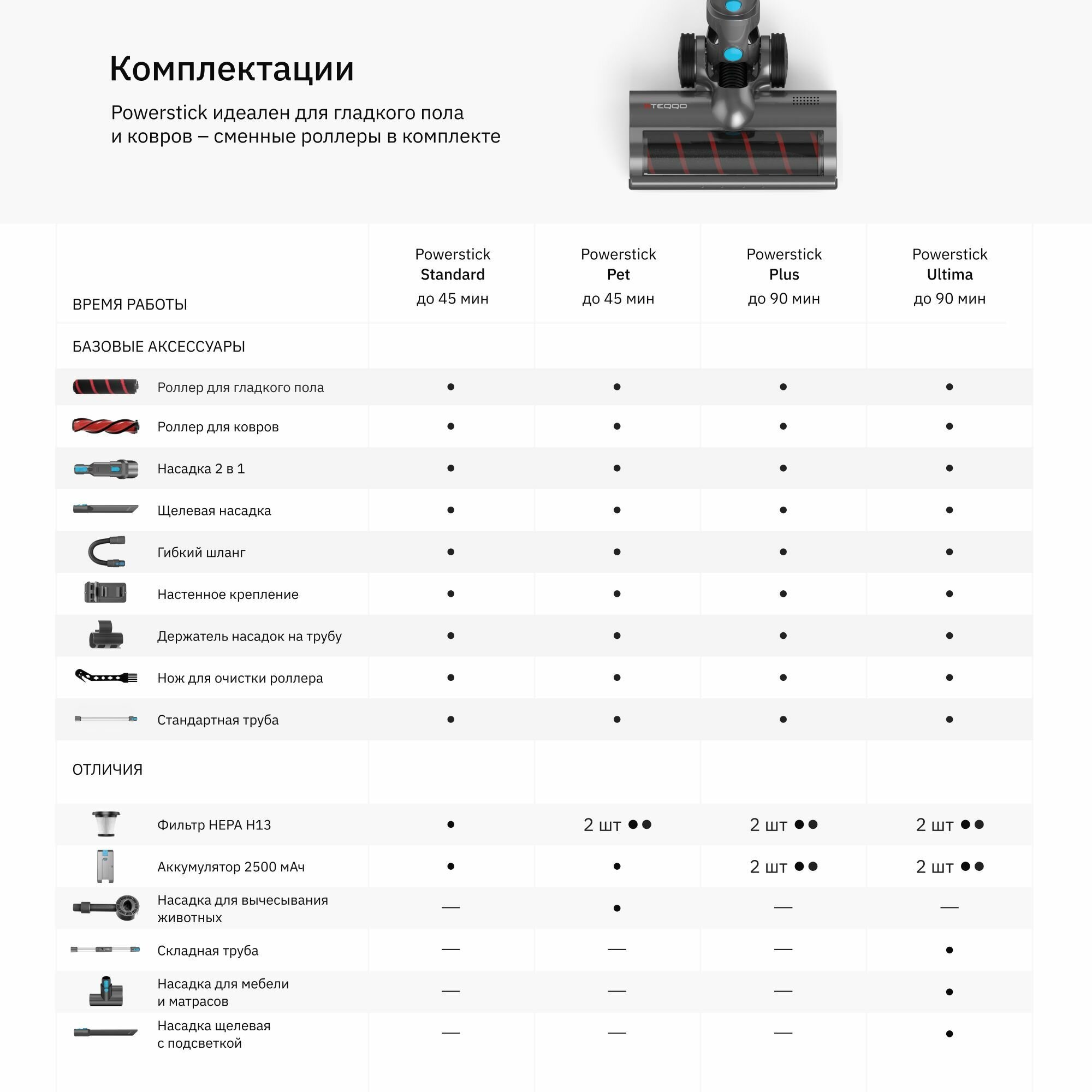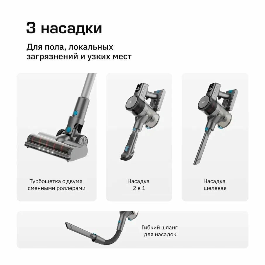 | Насадки в комплекте | Роллер для твердых покрытий, роллер для ковров, щетка 2 в 1 для мебели, щелевая насадка, стандартная турбощетка |