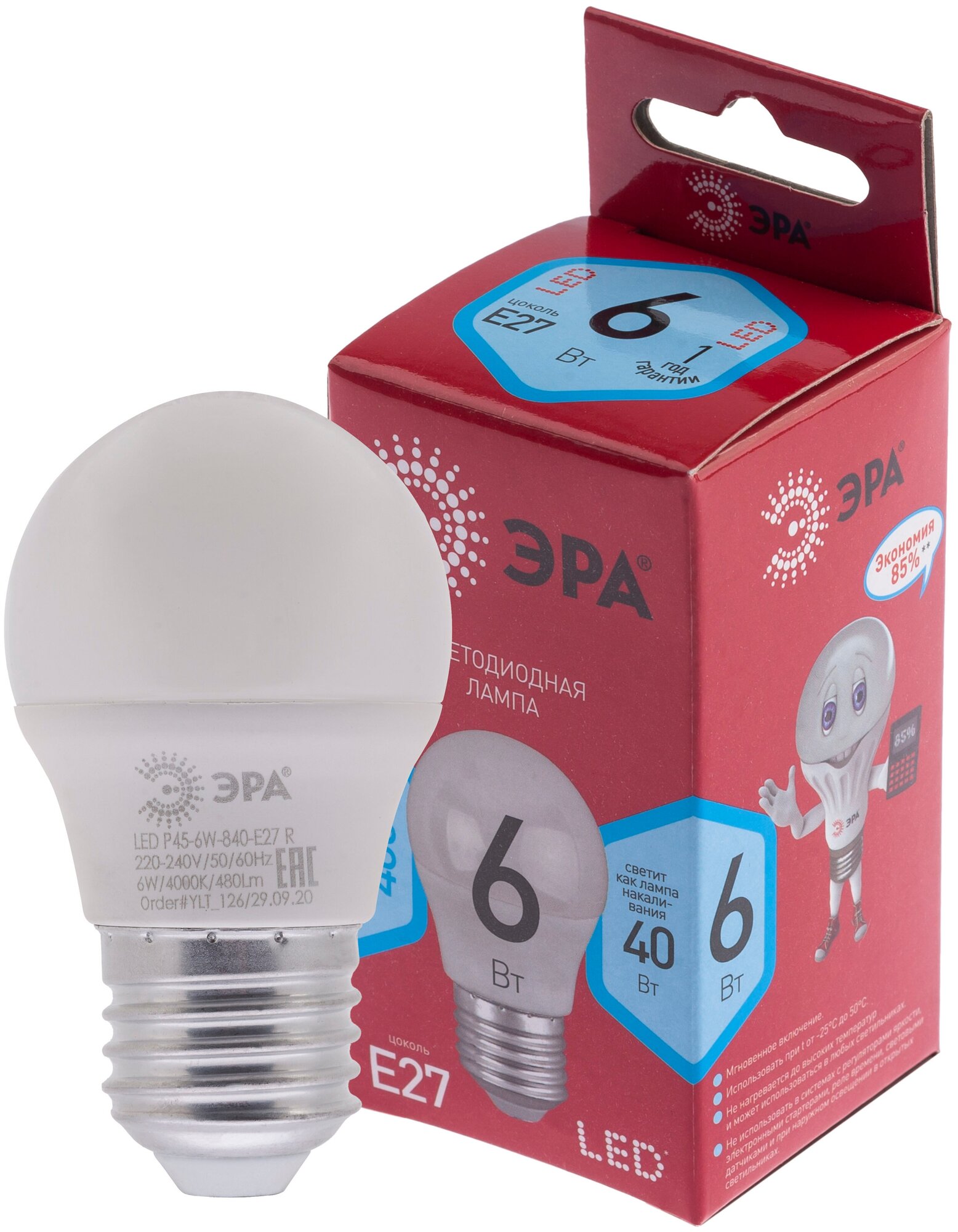 ЭРА ECO шар P45 E27 6W (480lm) 4000K 4K P45-6W-840-E27 R 120х45