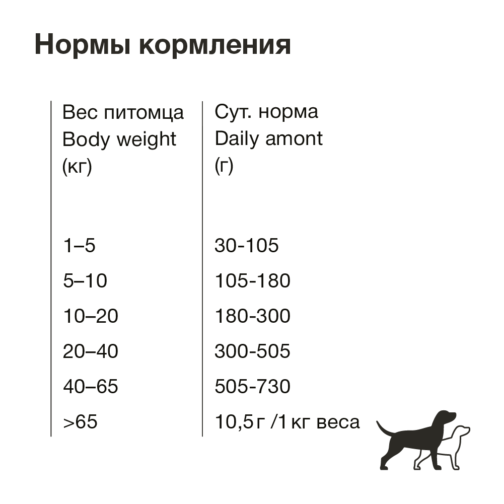 | Дозировка | 30-105 г – для собак весом 1-5 кг 105-180 г – для собак весом 5-10 кг 180-300 г – для собак весом 10-20 кг 300-505 г – для собак весом 20-40 кг 505-730 г – для собак весом 40-65 кг 10,5 г на 1 кг массы тела – для собак весом более 65 кг |