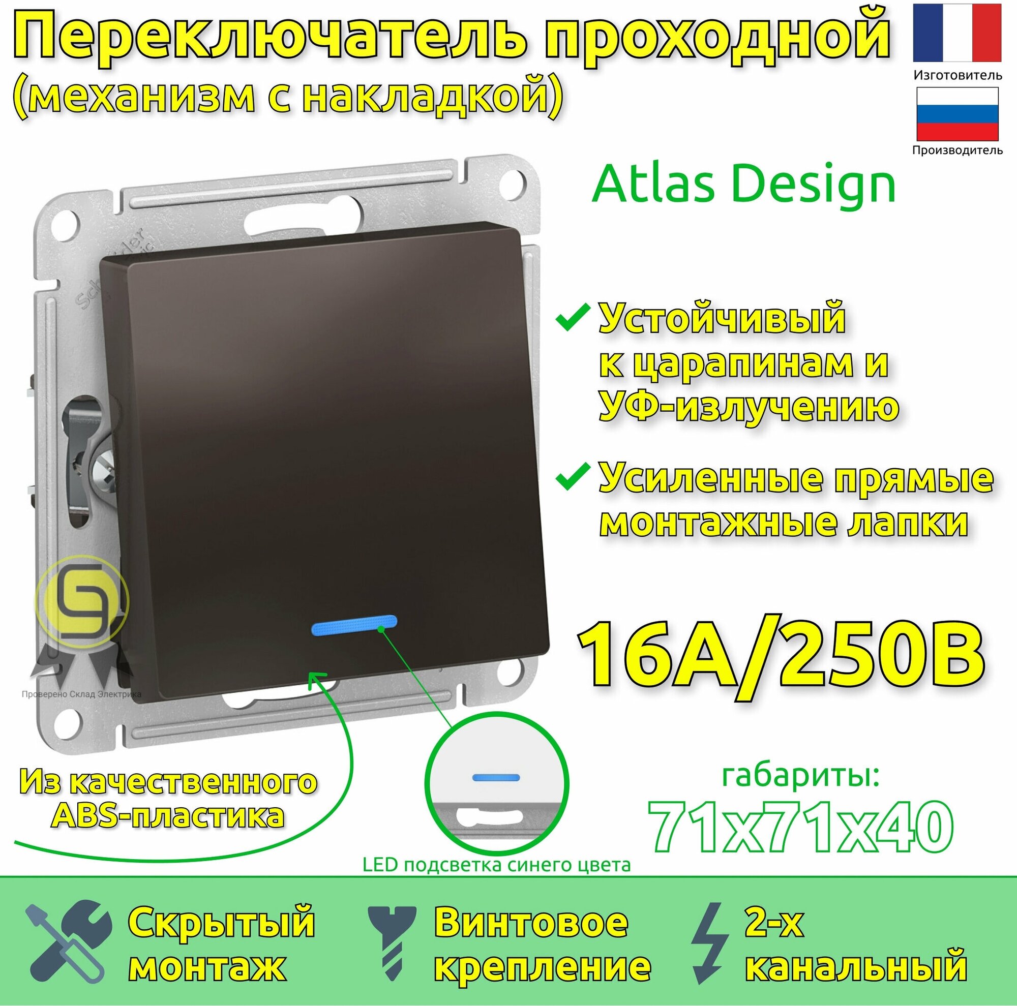 Проходной выключатель (переключатель) механизм с подсветкой Schneider Electric AtlasDesign, 1 клавиша, Мокко (комплект из 2шт)