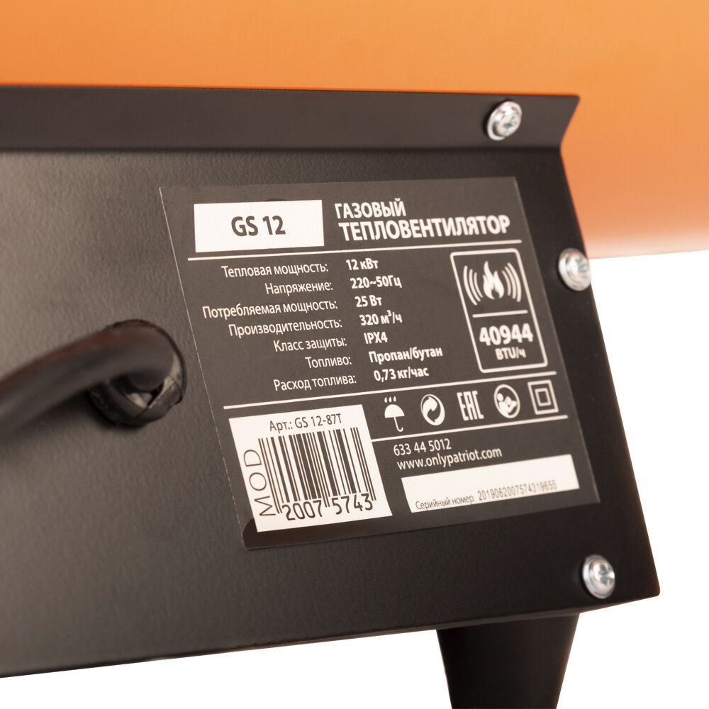 Калорифер газовый PATRIOT GS 12, 12 кВт, 320 м3/ч / портативный обогреватель / бытовой / тепловая пушка / теплогенератор