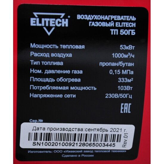 Ниже Вы можете прочитать отзывы на Elitech Пушка тепловая ТП 50ГБ, ознакомится с подробными характеристиками, посмотреть интересные обзоры и фотографии на Elitech Пушка тепловая ТП 50ГБ.