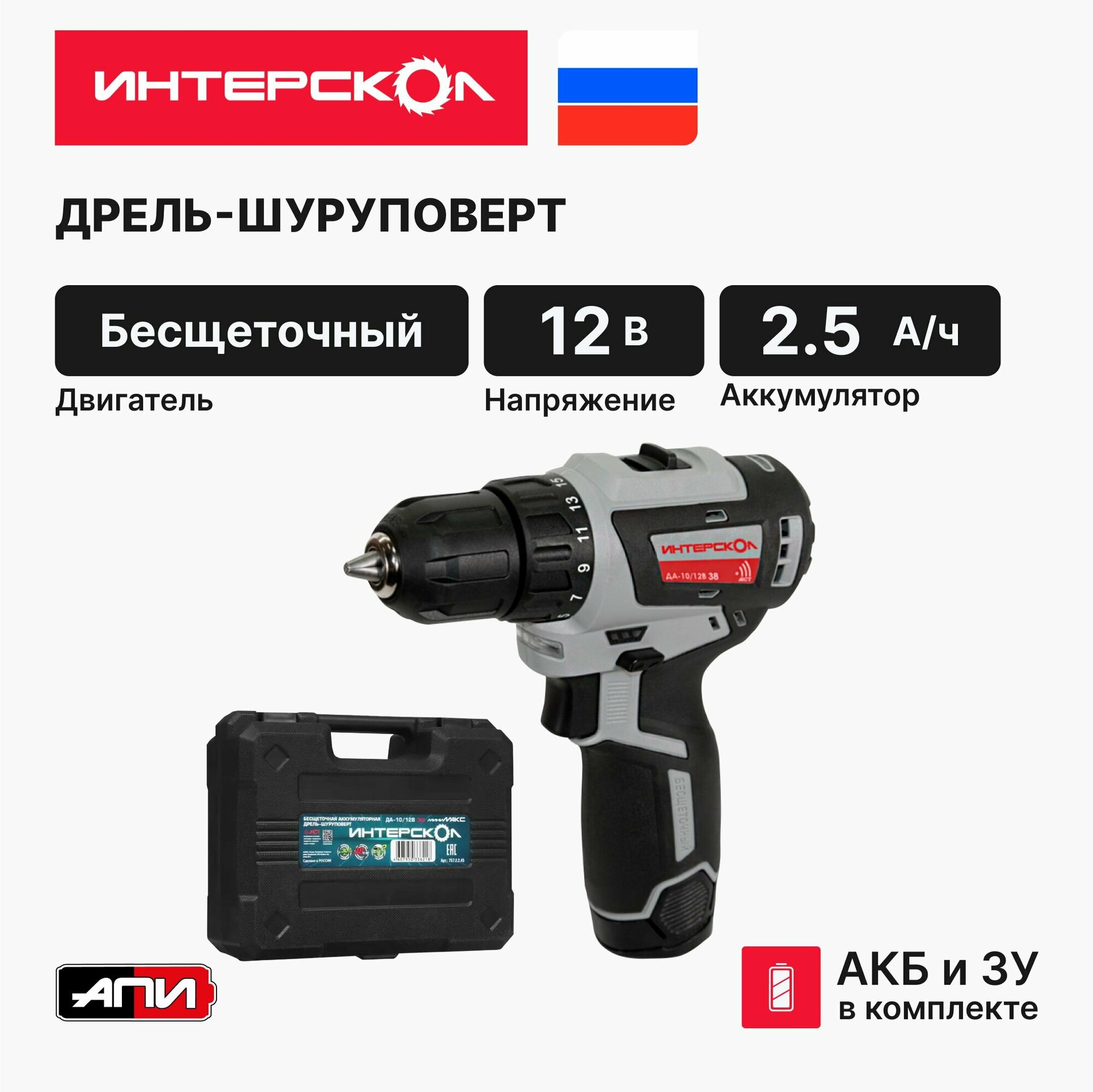 Дрель-шуруповерт аккумуляторная ИНТЕРСКОЛ ДА-10/12В 38 минимакс бесщеточная 2 2,5ач, зу