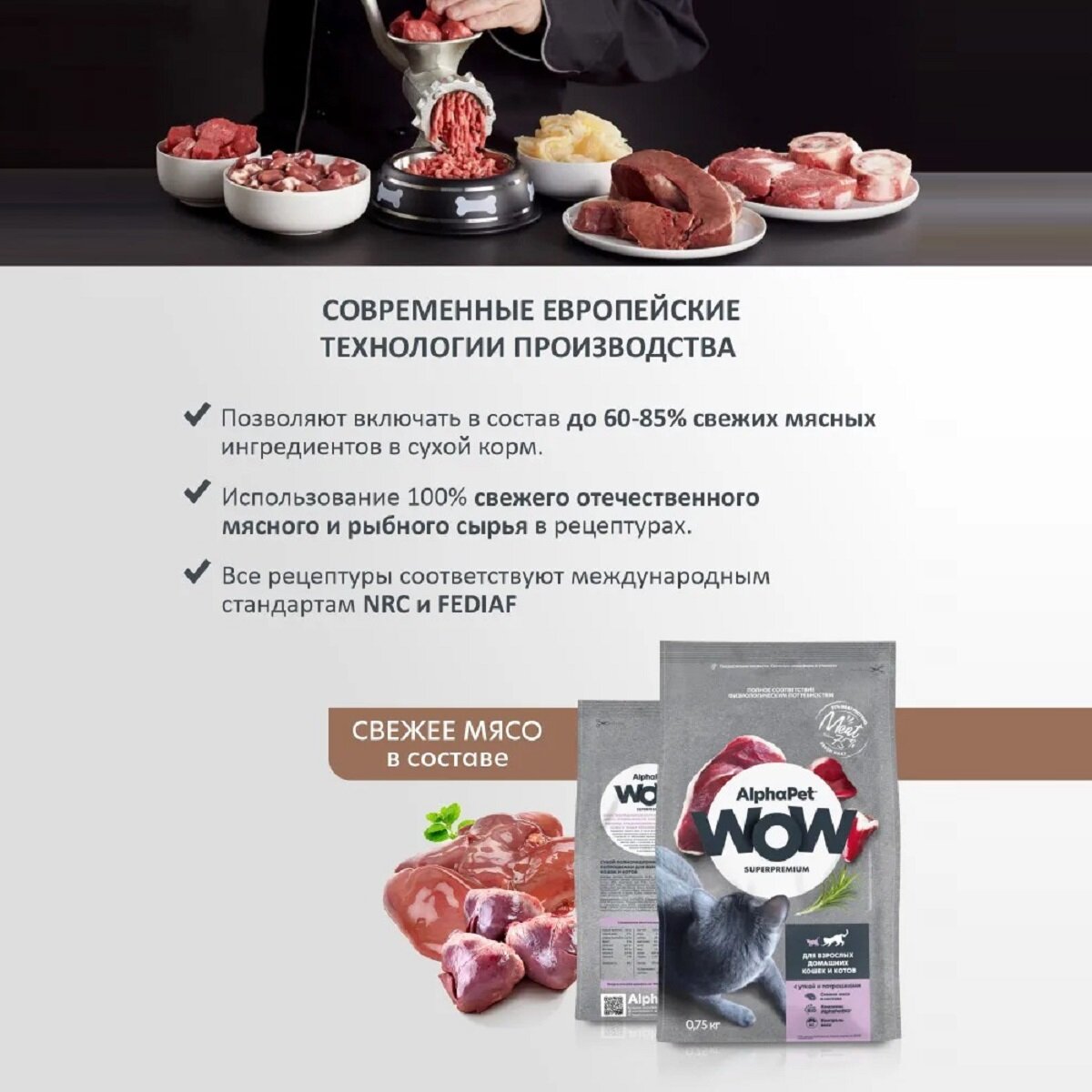ALPHAPET WOW SUPERPREMIUM корм для домашних кошек с уткой и потрошками 750гр