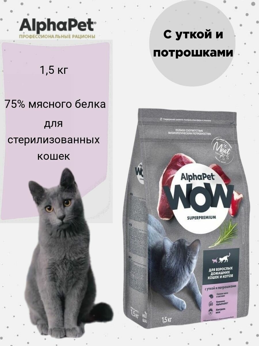AlphaPet WOW Сухой полнорационный корм Superpremium с уткой и потрошками, для взрослых домашних кошек и котов, 1,5 кг