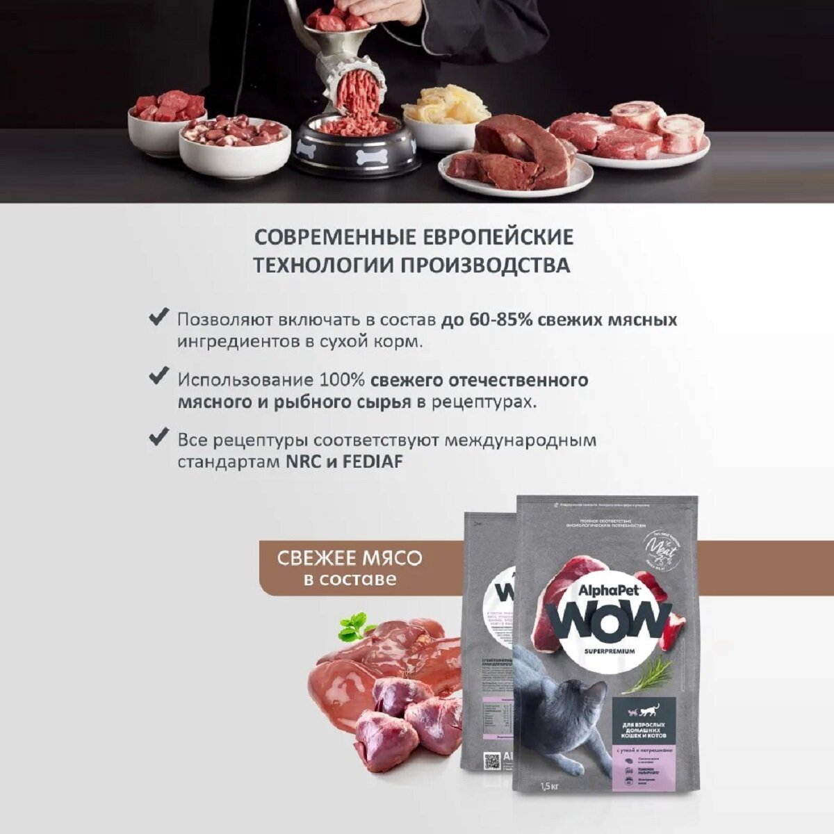ALPHAPET WOW SUPERPREMIUM для взрослых кошек живущих дома с уткой и потрошками (1,5 кг)