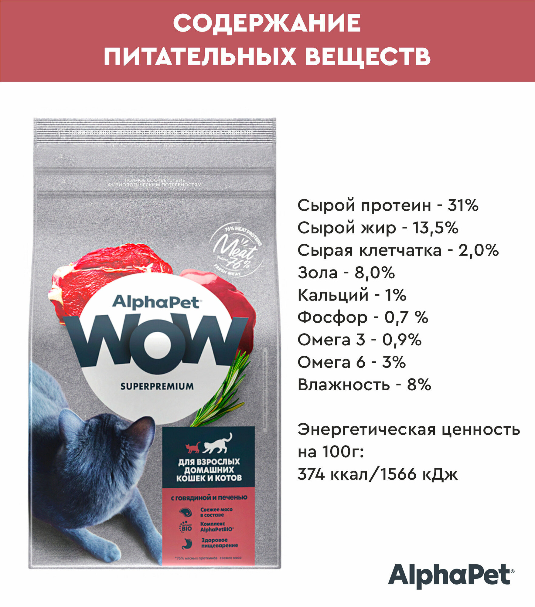 AlphaPet WOW Сухой полнорационный корм Superpremium c говядиной и печенью, для взрослых домашних кошек и котов, 1,5 кг
