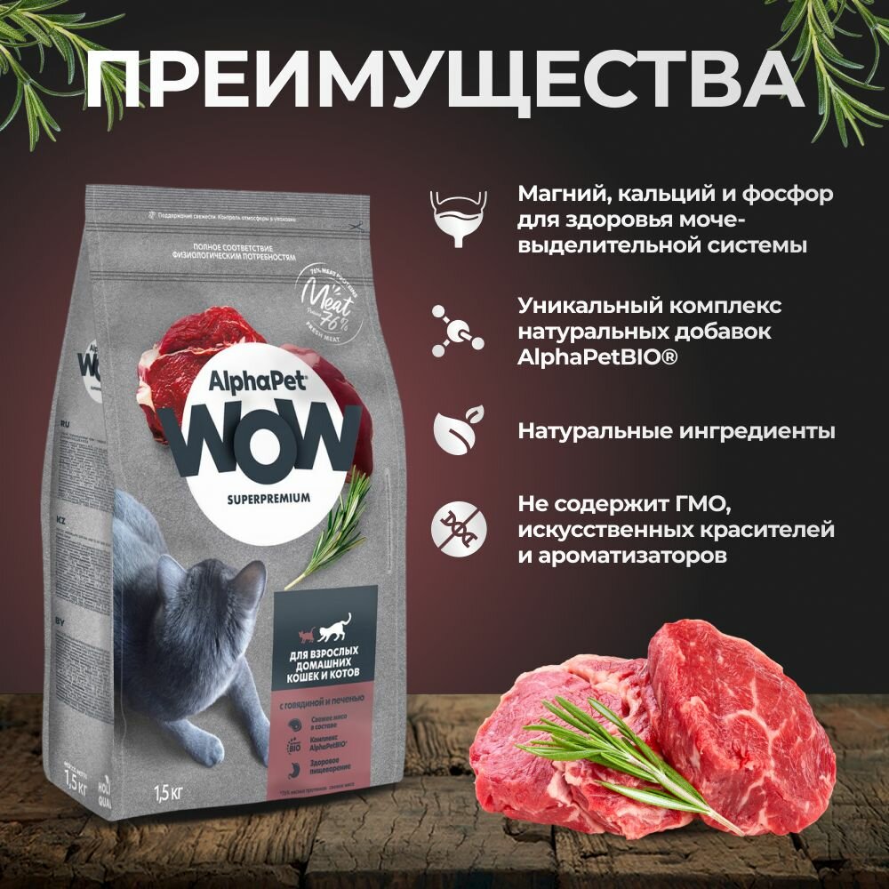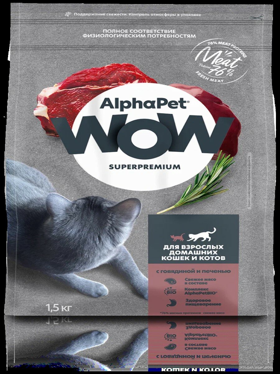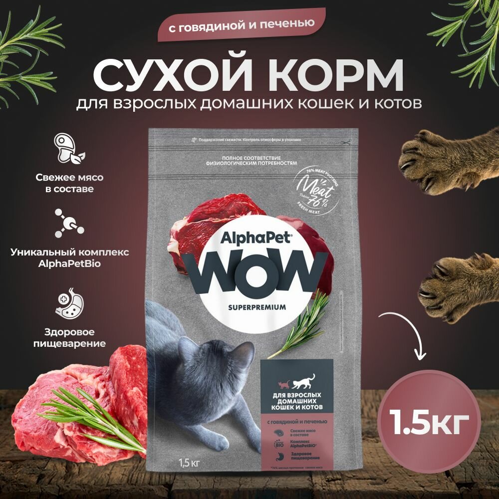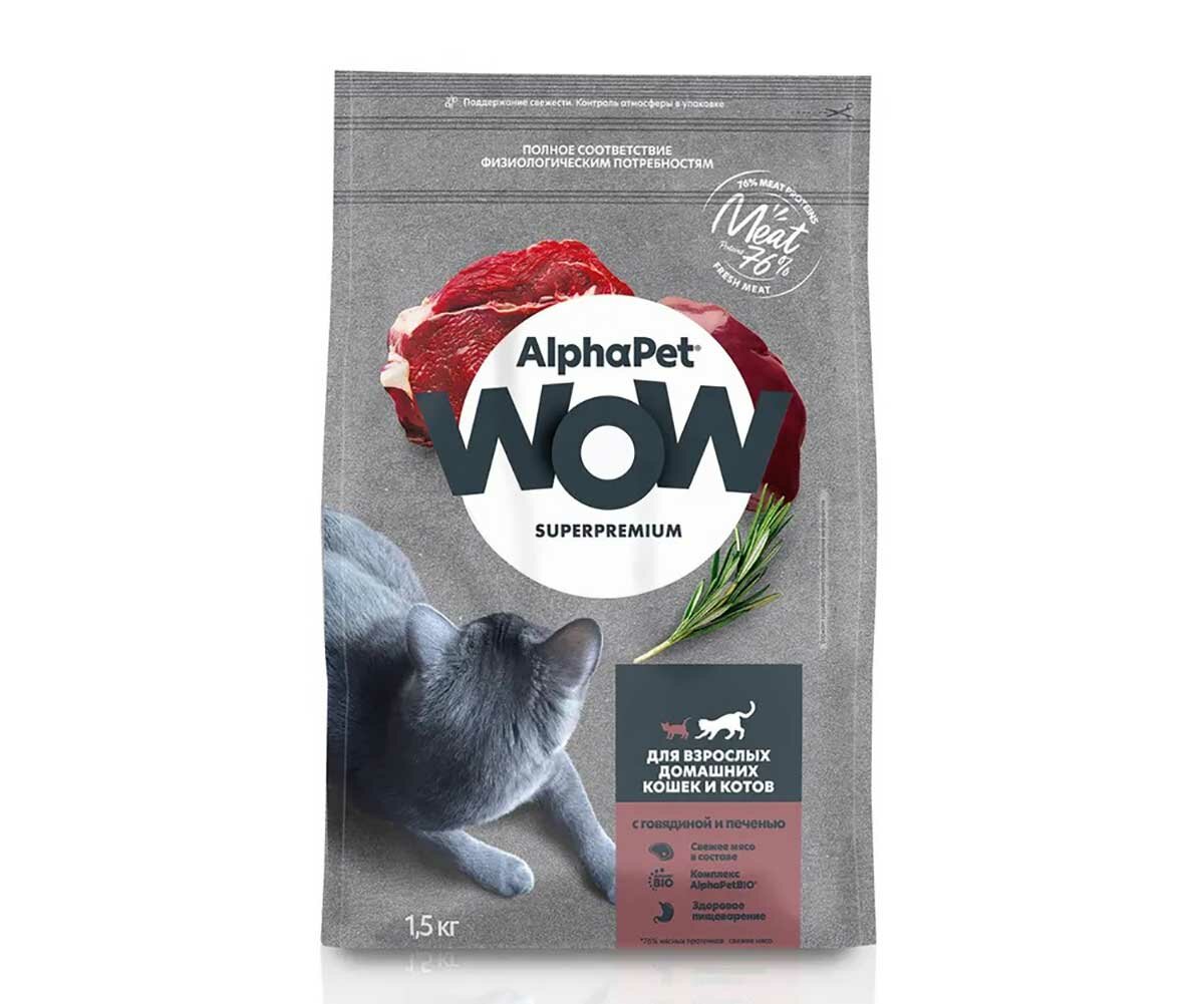 AlphaPet WOW Сухой полнорационный корм Superpremium c говядиной и печенью, для взрослых домашних кошек и котов, 1,5 кг