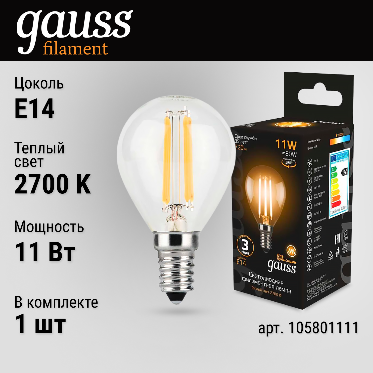Gauss Filament Шар G45 E14 11W 720lm 2700K 2K прозр. филамент (нитевидная) 105801111 (арт. 677161)