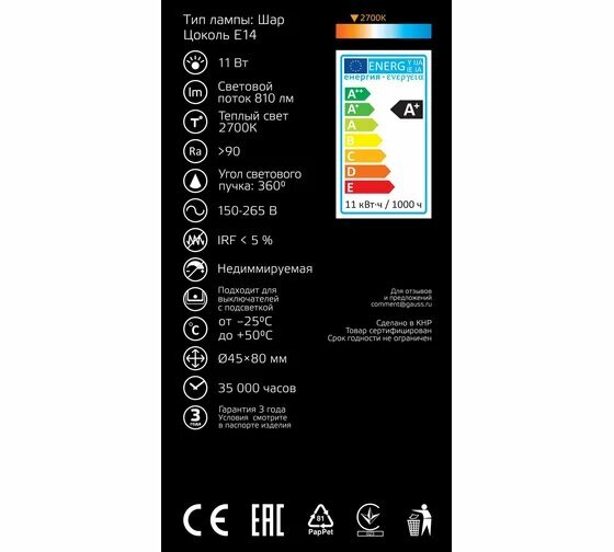 Лампа светодиодная gauss 105801111, E14, G45, 11 Вт, 2700 К