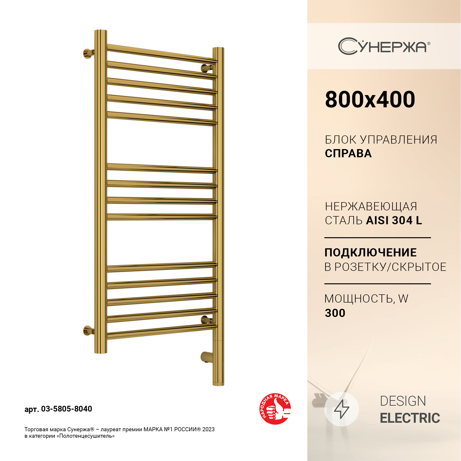 Полотенцесушитель электрический Сунержа Богема 3.0 прямая 80х40 матовое золото, правый