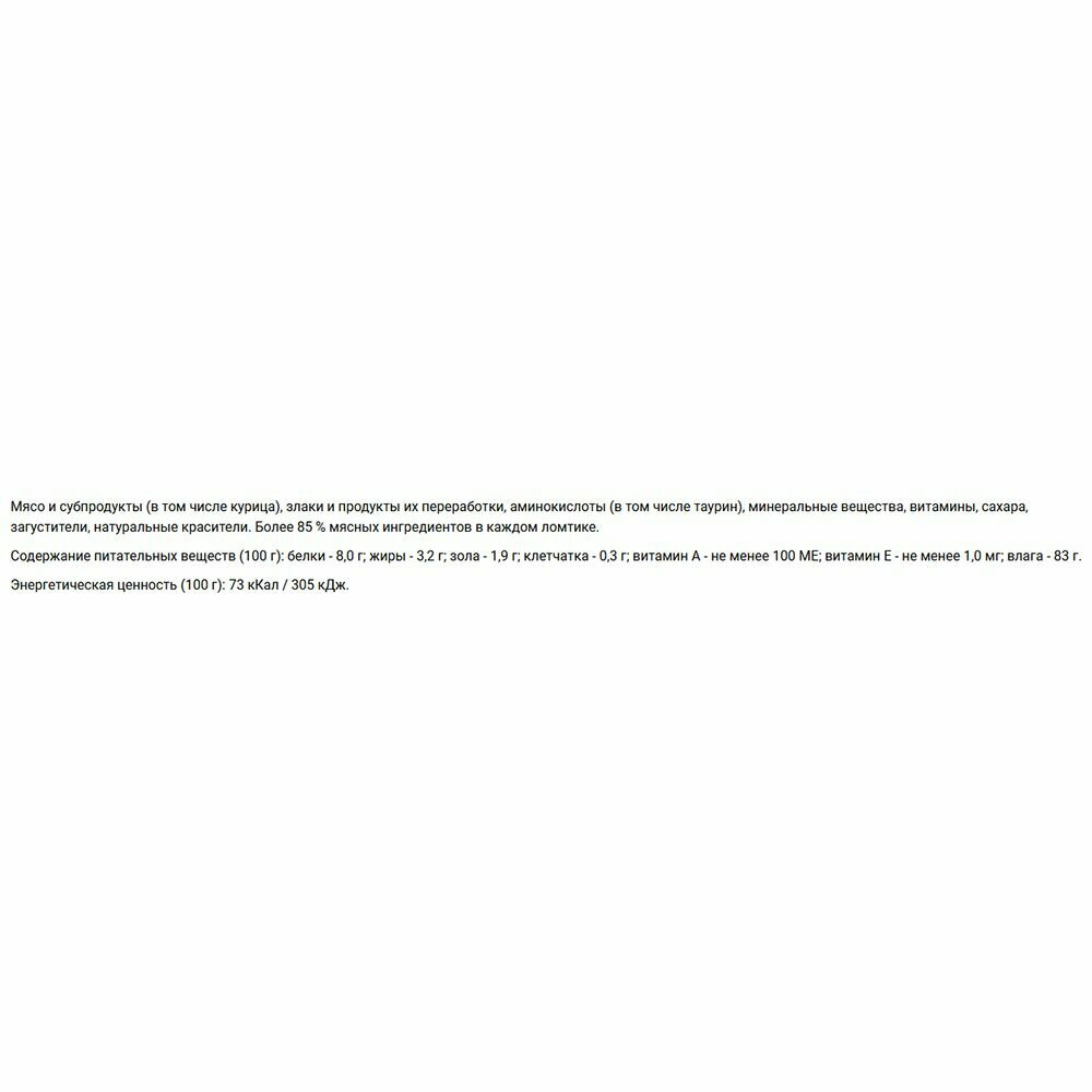| Состав | мясо и субпродукты (в том числе курица и индейка), злаки и продукты их переработки, аминокислоты (в том числе таурин), минеральные вещества, витамины. Более 85% мясных ингредиентов в каждом ломтике |