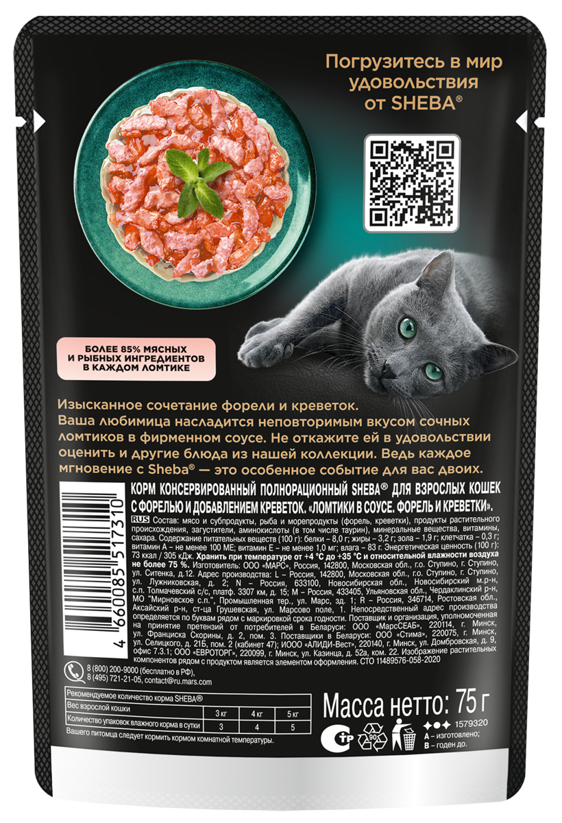 SHEBA 75гр Корм для кошек ломтики в соусе Форель и Креветки (пауч)