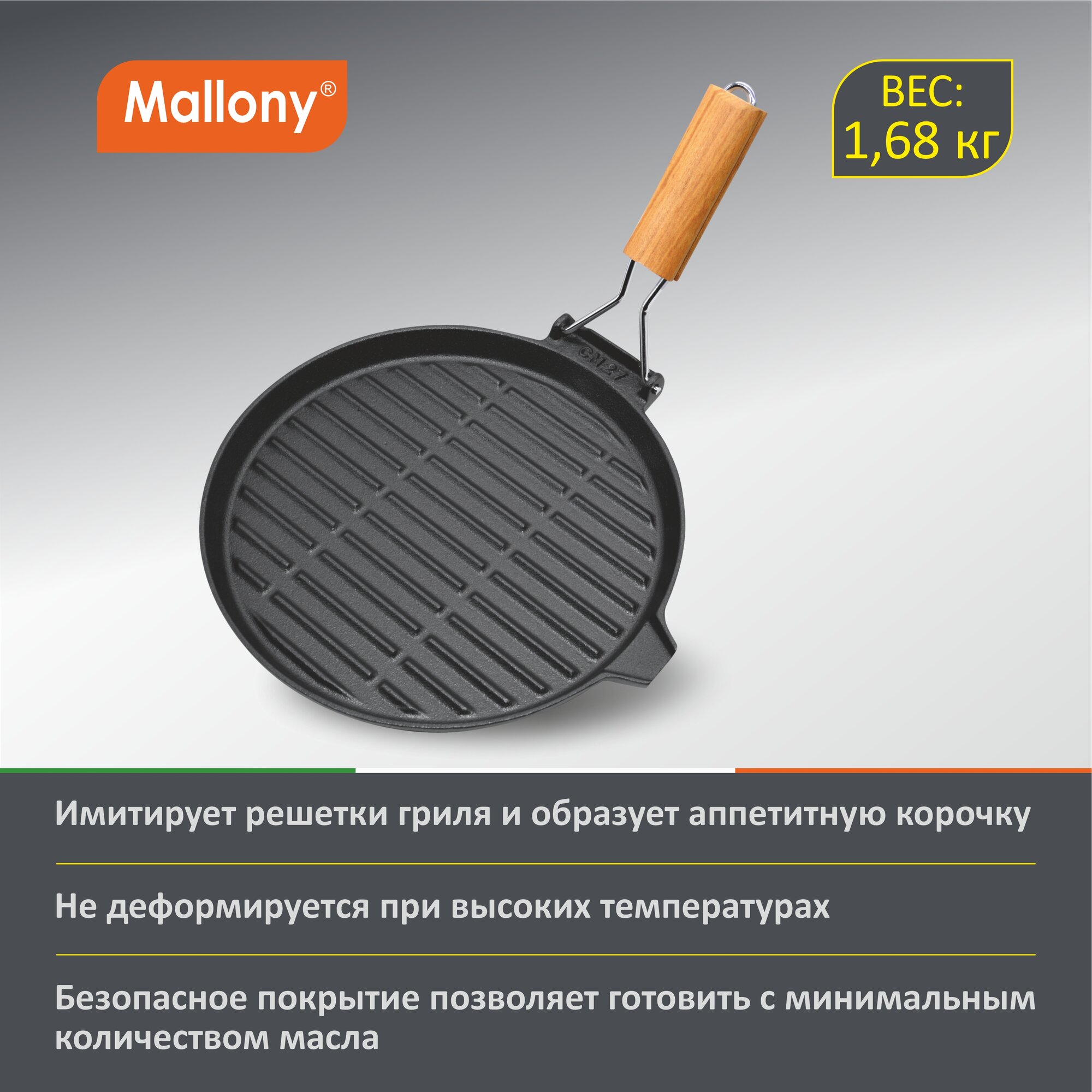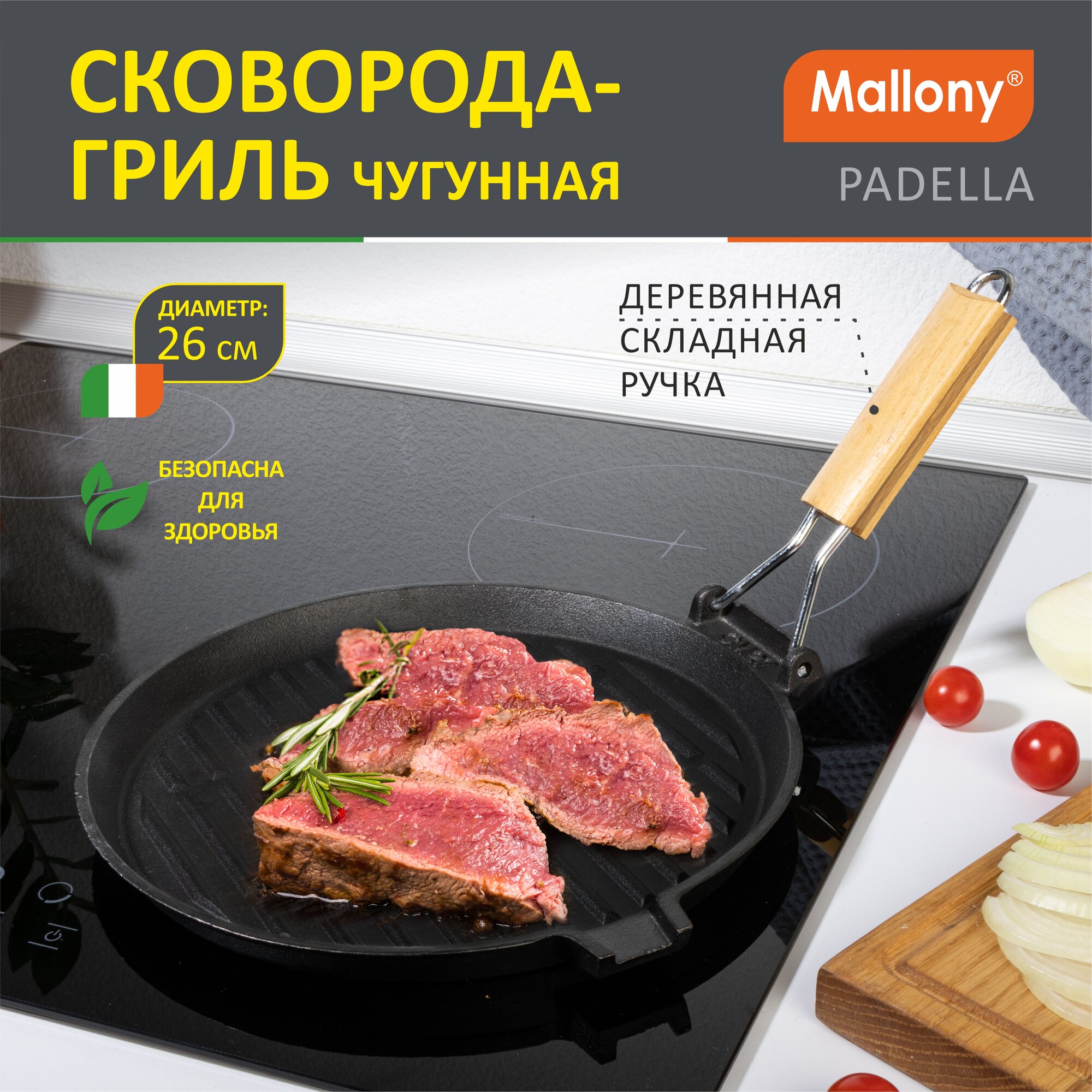 Сковорода-гриль чугунная Mallony Padella с деревянной складной ручкой, диаметр-26 см (985059)
