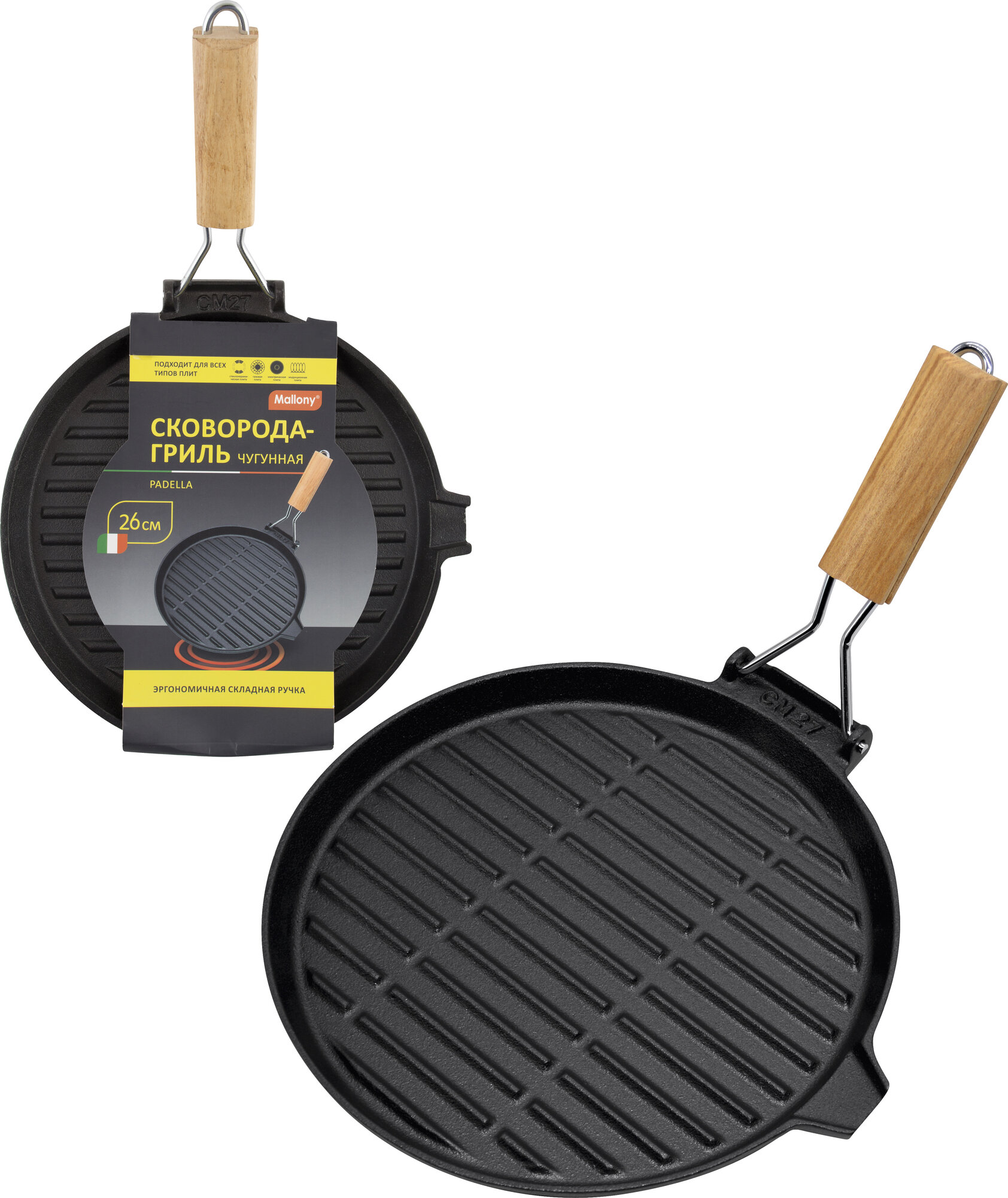 Сковорода-гриль чугунная с деревянной складной ручкой PADELLA, диа 26 см,тм Mallony