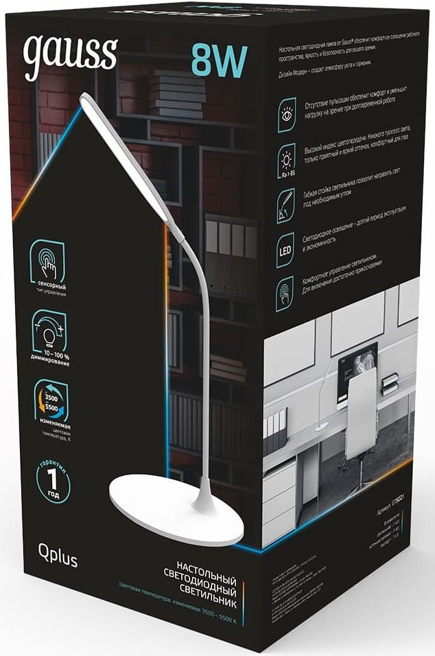 Светильник настольный Gauss Qplus модель GTL502 8W 500lm 3500-5500K 170-265V белый диммируемый LED 1/12