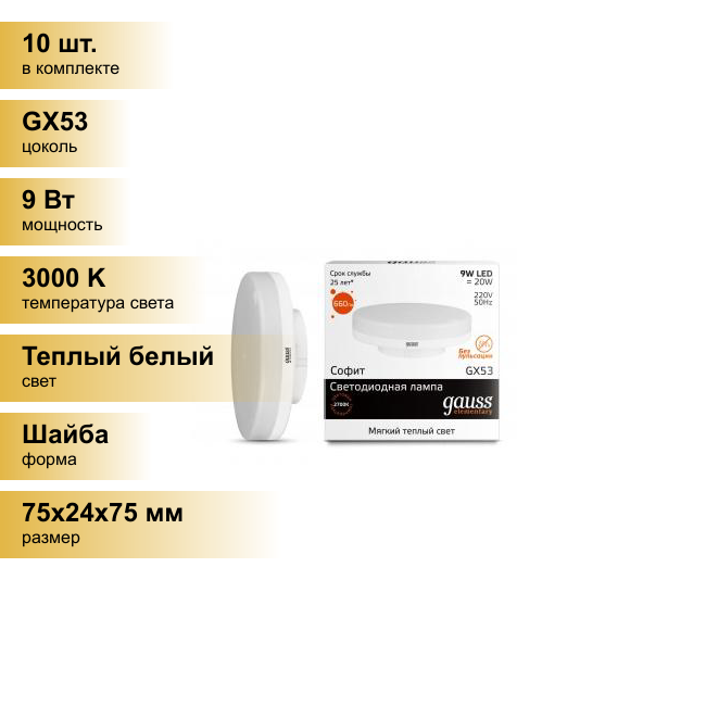 (10 шт.) Светодиодная лампочка Gauss Elementary GX53 9W(660lm) 3000K 2K 75x24 пластик/алюм. 83819