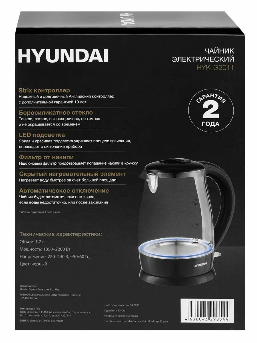 Чайник электрический Hyundai HYK-G2011, 2200Вт, черный