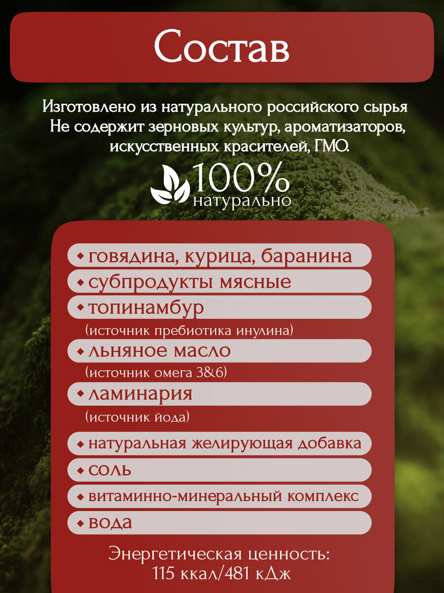 | Состав | говядина, курица, баранина, субпродукты мясные, топинамбур, льняное масло, ламинария, натуральная желирующая добавка, соль, витаминно-минеральный комплекс, вода |