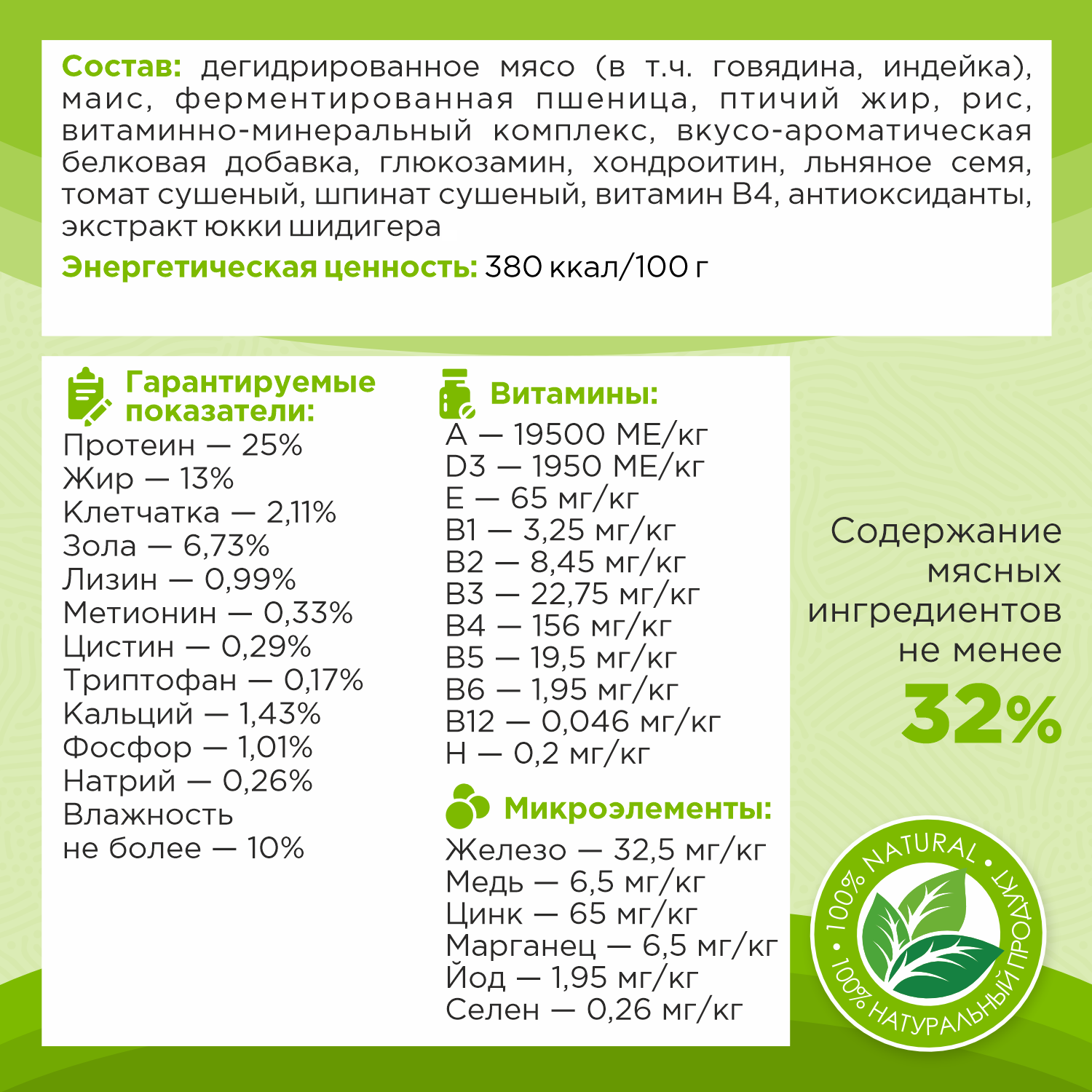 | Состав | Дегидрированное мясо говядины, индейки, ферментированная пшеница (источник пищевых волокон), маис, птичий жир, сушеная мякоть сахарной свеклы (способствует улучшению работы ЖКТ), льняное семя (источник Омега-3, Омега-6), пивные дрожжи (натуральный источник пребиотиков MOS), натуральные вкусоароматические добавки, рыбий жир, подсолнечное масло, клюква, экстракт Юкки Шидигера, лизин, метионин, натуральный антиоксидант. |