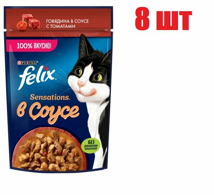 Купить Влажный корм для кошек Felix Sensations с говядиной в соусе с томатами 75 г 8 шт