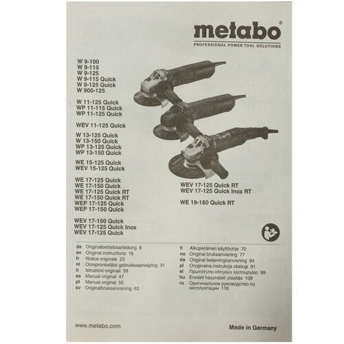 | Комплектация | защитный кожух, опорный фланец, зажимная гайка M-Quick, дополнительная рукоятка Metabo VibraTech (MVT) |