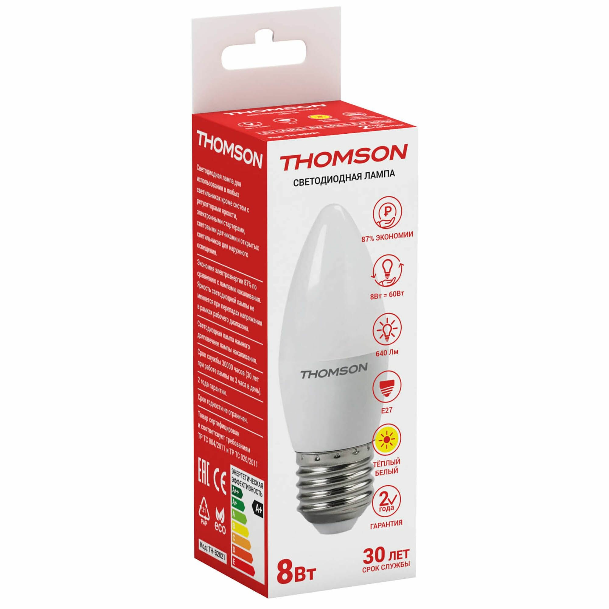 Лампочка Thomson TH-B2021 8 Вт, E27, 3000K, свеча, теплый белый свет