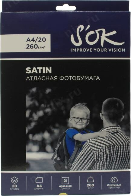 Фотобумага S’ok Premium S'OK атласная (сатин), формат А4, плотность 260г/м2, 20 листов