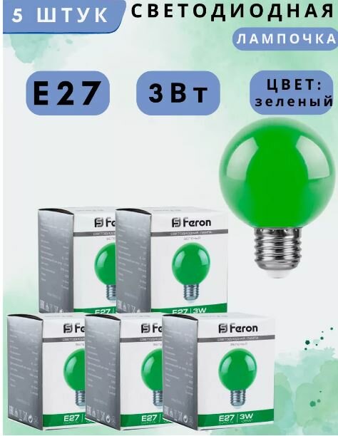 Светодиодная лампочка Feron, шар, E27, 3W, зеленый свет, 10 штук, IP20