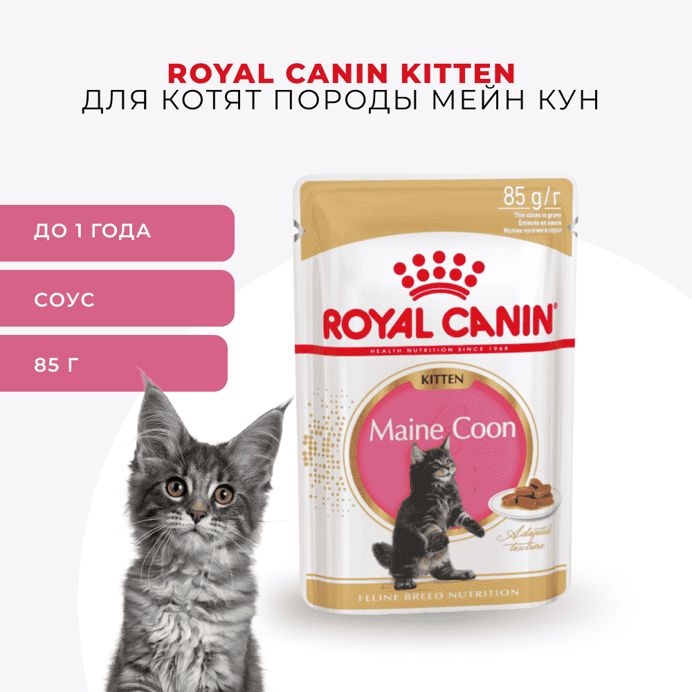 СохранитьRoyal Canin Maine Coon Kitten влажный корм для котят породы мейн-кун до 15 месяцев, в соусе, в паучах - 85 г интересное: