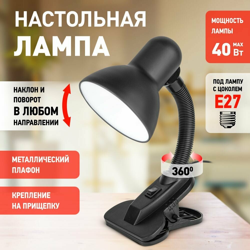 Светильник настольный под лампу на прищепке 40Вт E27 черный N-102-E27-40W-BK ЭРА