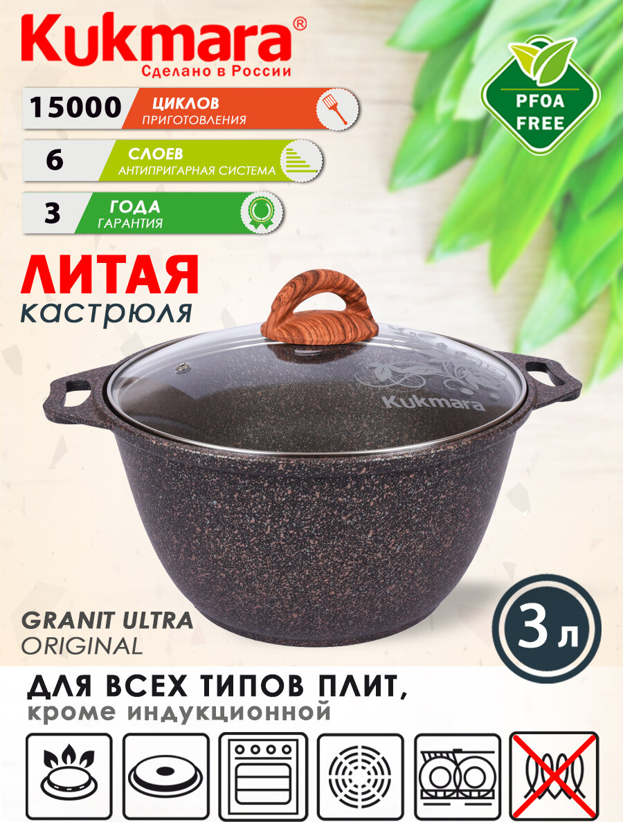 KUKMARA Кастрюля Granit ultra, 3 л, стеклянная крышка, антипригарное покрытие
