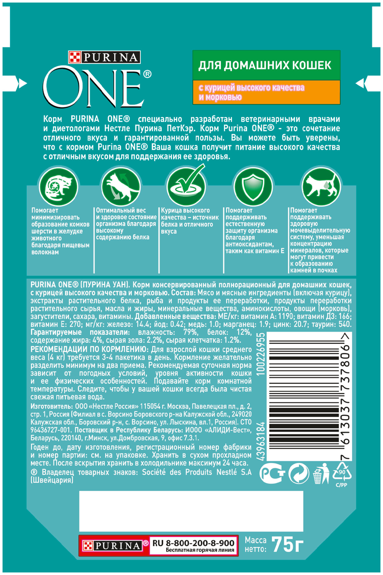Влажный корм Purina ONE для домашних кошек, с курицей и морковью, Пауч, 75 г*26 шт